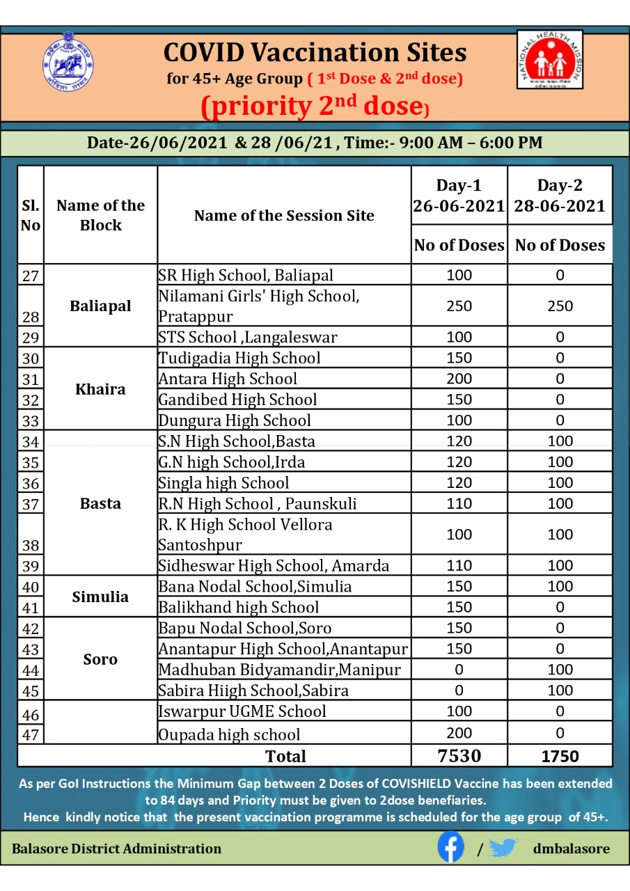 Dm Balasore On Twitter Kindly Find The Vaccination Schedule For The 45 Age Group For The 1st And 2nd Dose On 26th 28th June 2021 Thers Is No Online Registration But